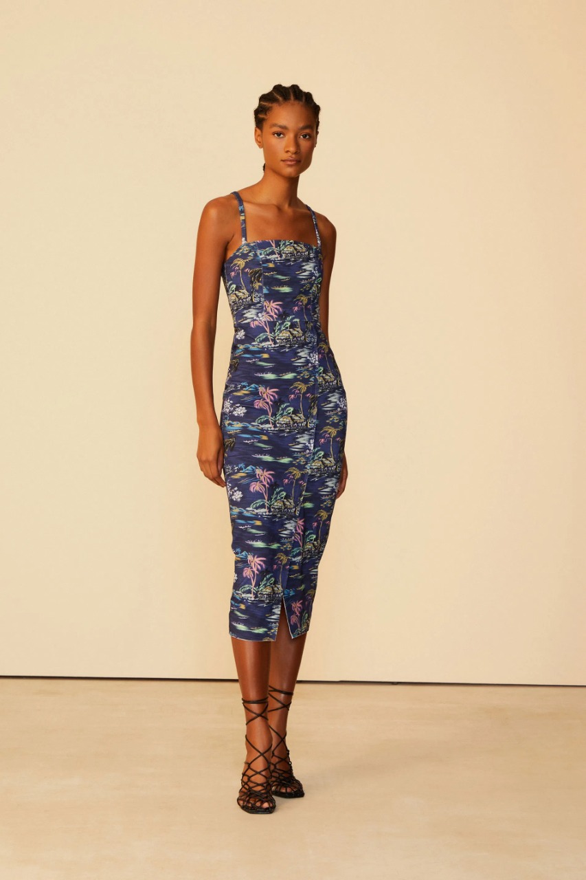 Vestido de malha bandagem estilo lápis estampa paisagem cabana sodalita - est paisagem cabana sodalita e chiclete