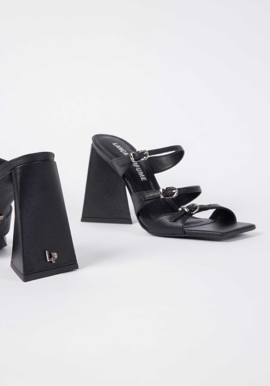 Para Quem Ama Um Visual Com Informação De Moda, Esta Sandália É A Pedida. Possui Bico Quadrado, Salto Alto Geométrico E Tiras Com Fivelas Reguláveis. Detalhe Para A Aplicação Exclusiva Lp No Salto.